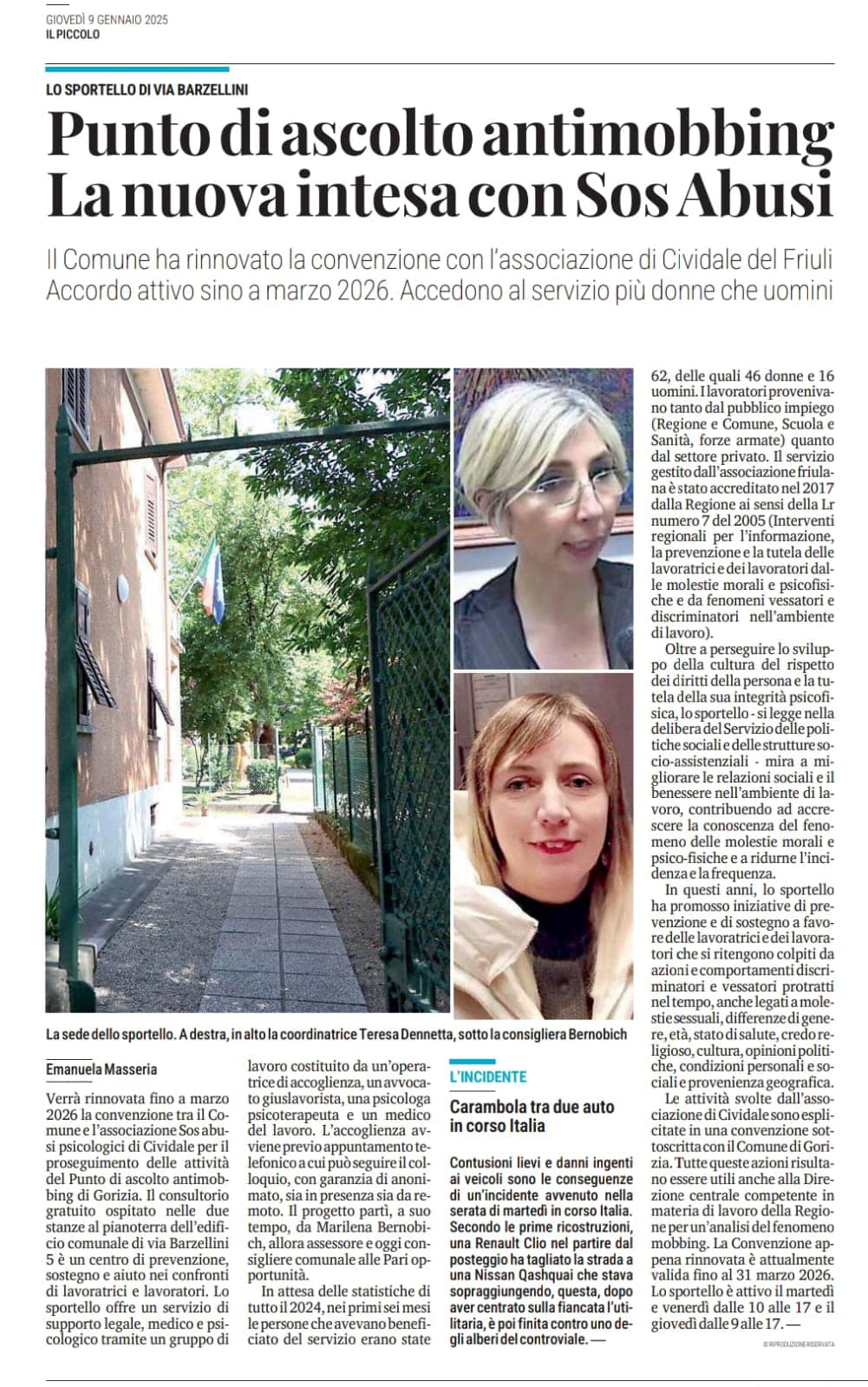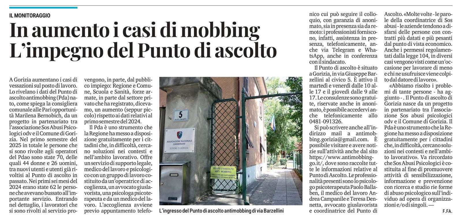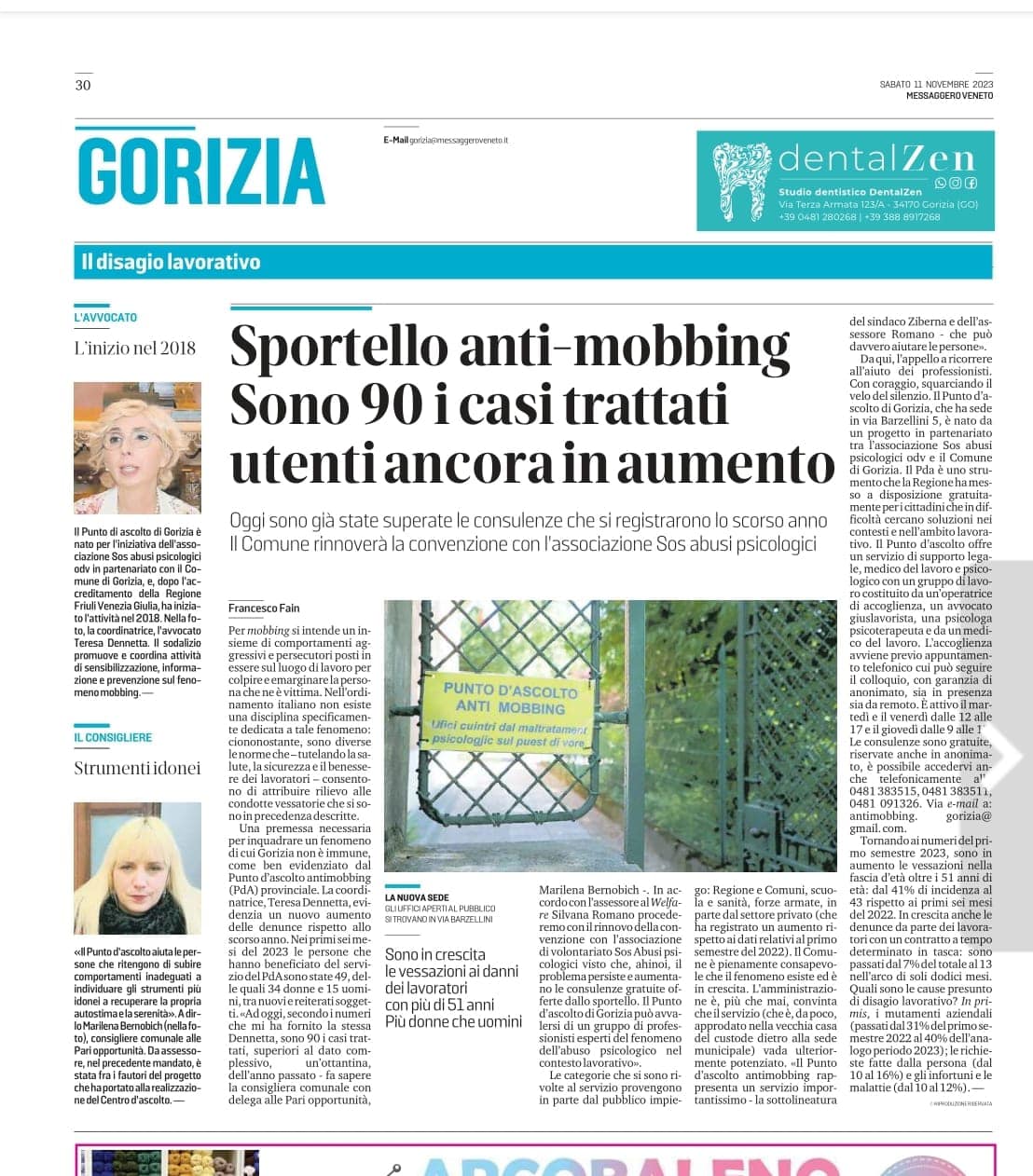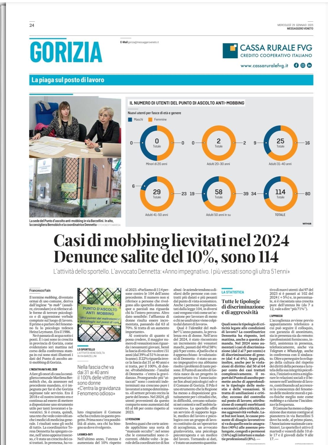 L’attività del Punto di Ascolto Antimobbing di Gorizia viene regolarmente seguita dai media locali e nazionali. In questa sezione raccogliamo articoli, interviste e servizi che raccontano il nostro impegno e l’importanza del servizio per il territorio.