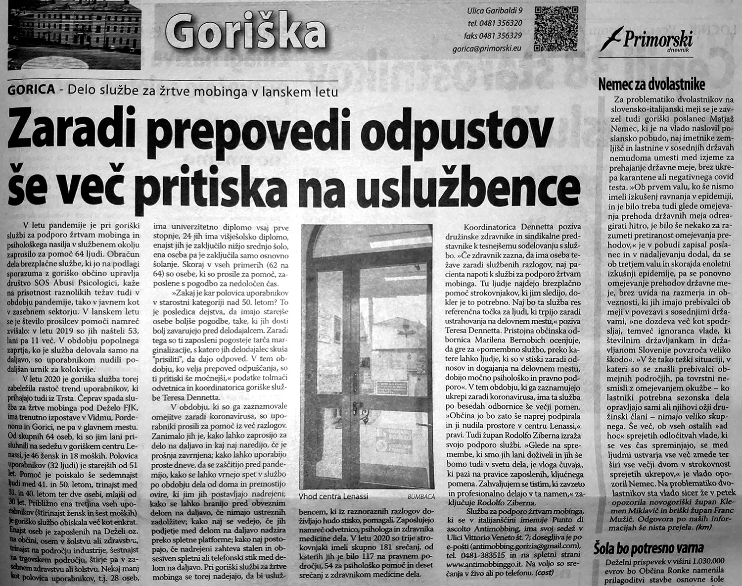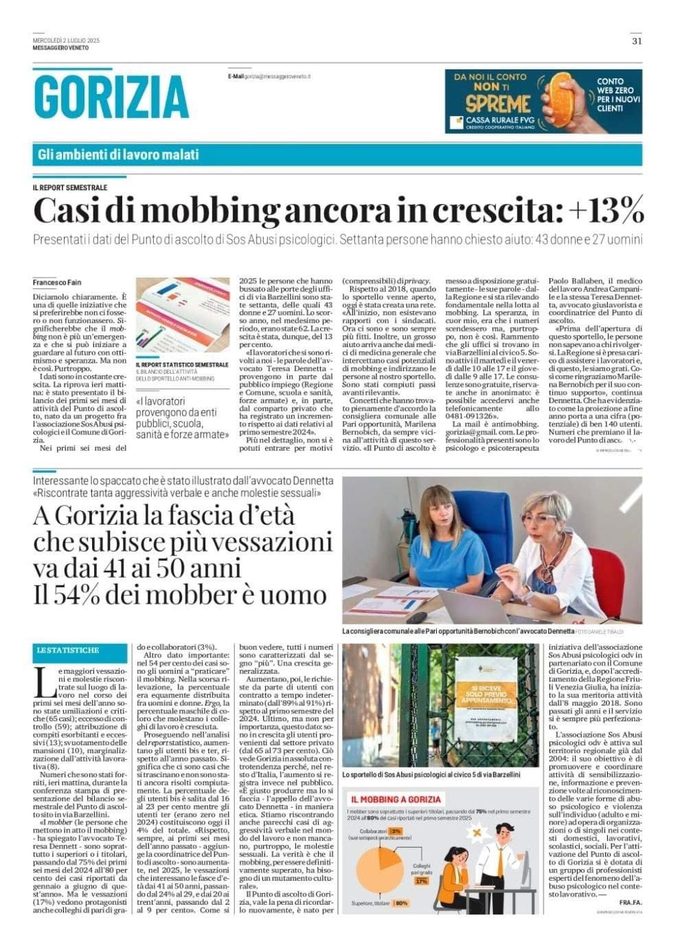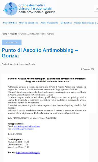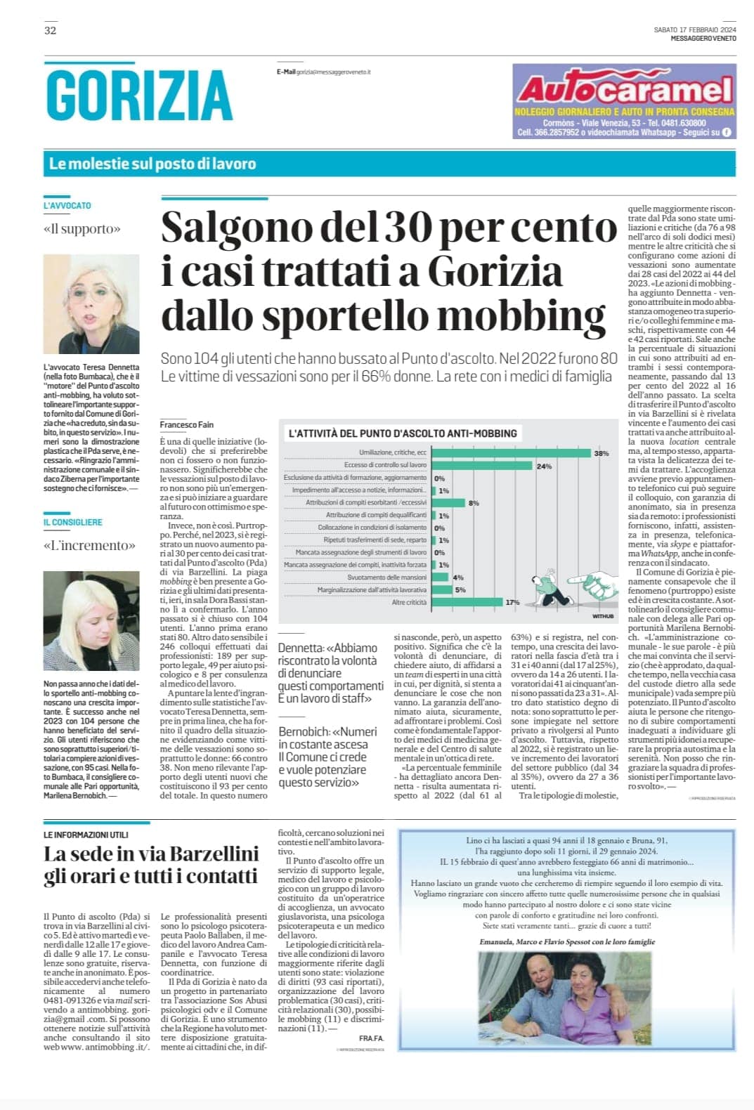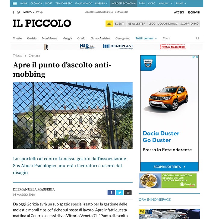 L’attività del Punto di Ascolto Antimobbing di Gorizia viene regolarmente seguita dai media locali e nazionali. In questa sezione raccogliamo articoli, interviste e servizi che raccontano il nostro impegno e l’importanza del servizio per il territorio.