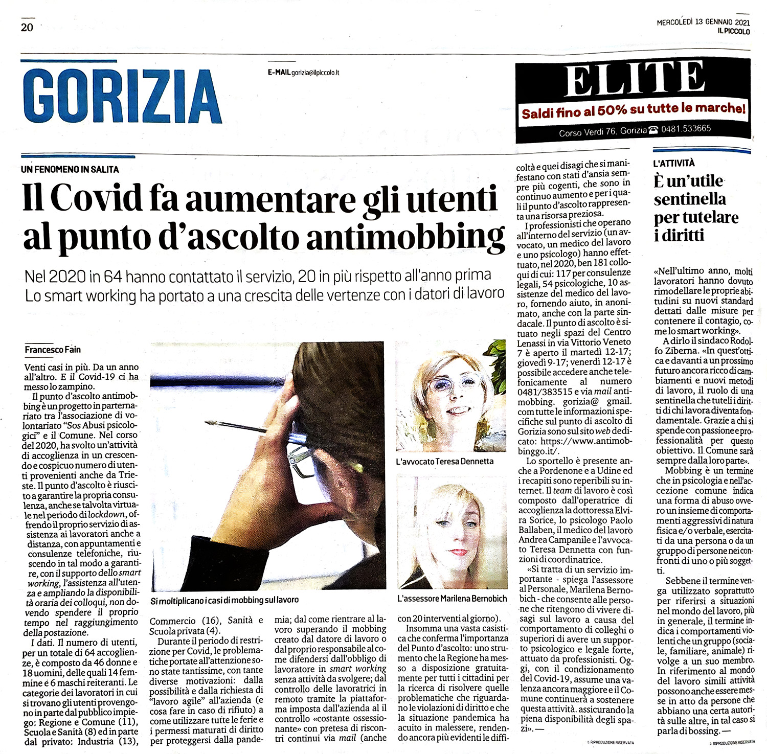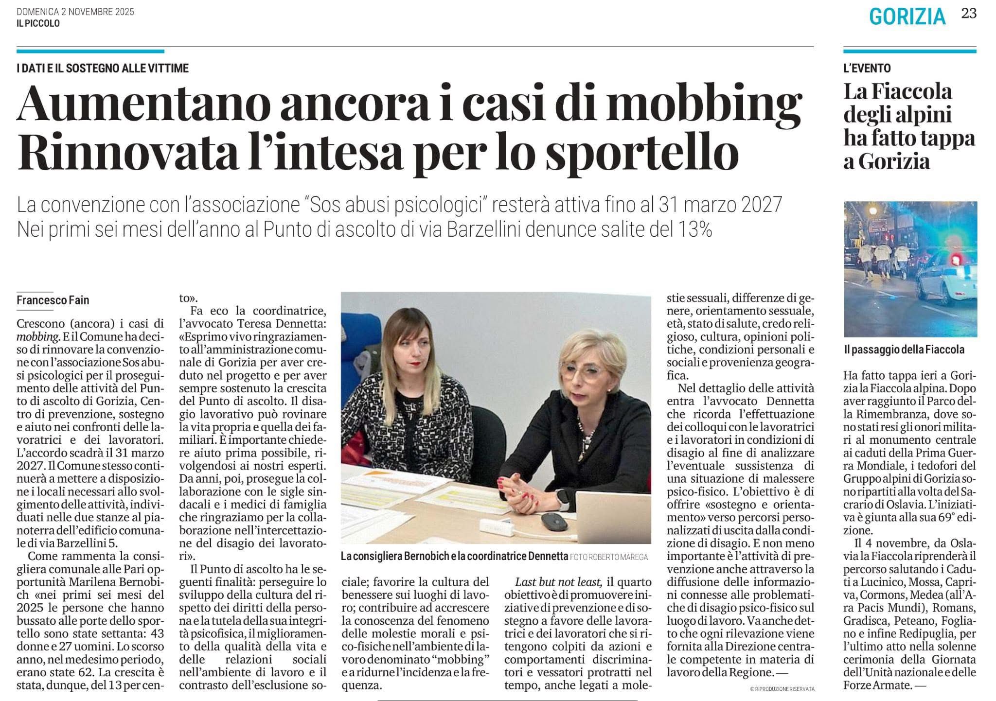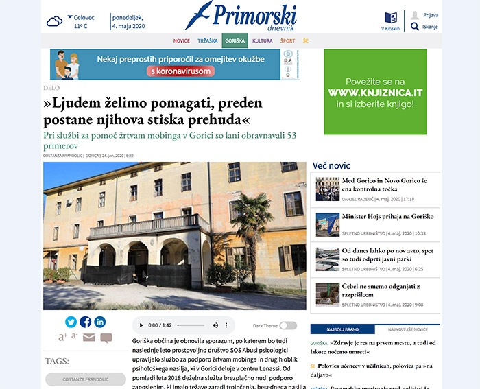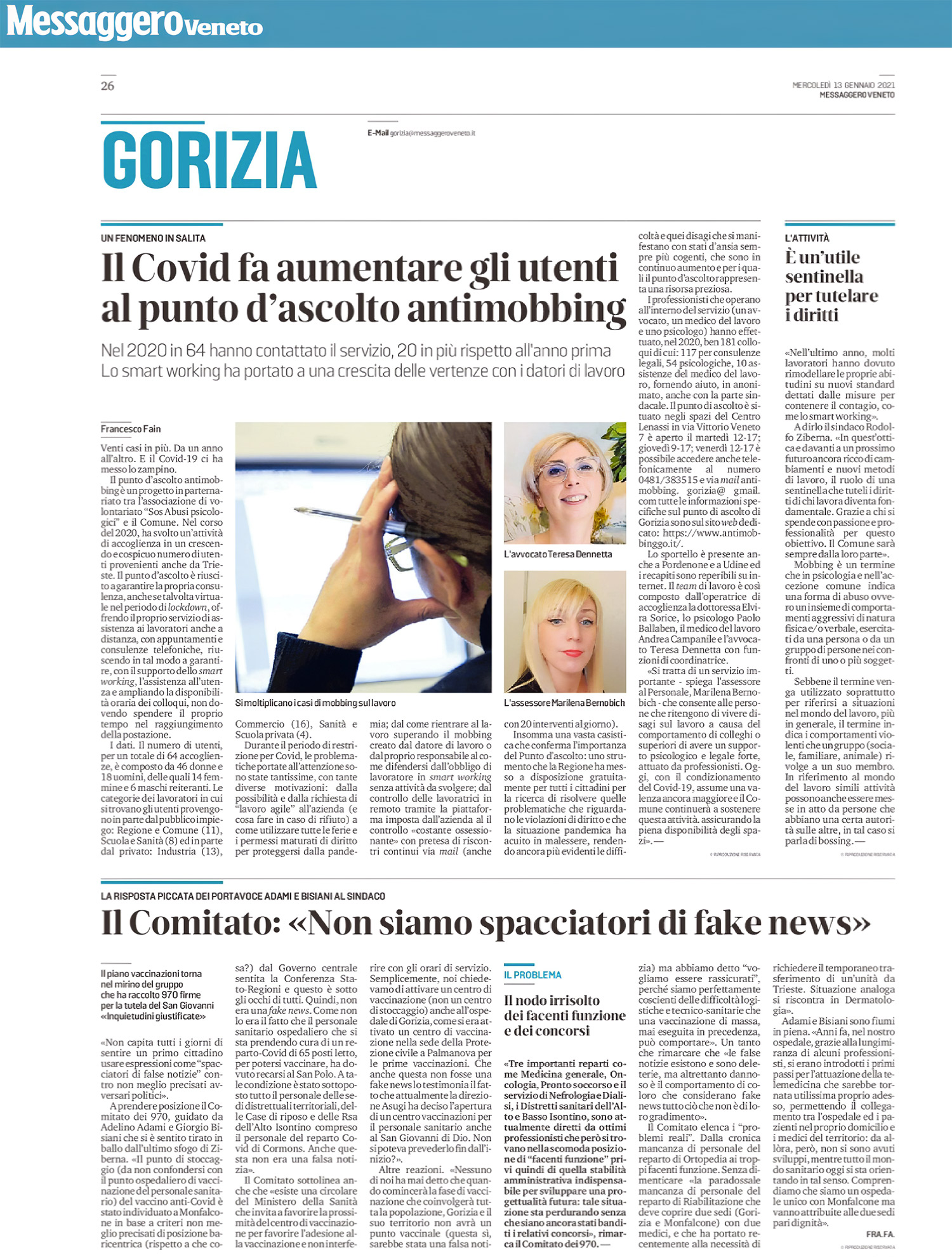 L’attività del Punto di Ascolto Antimobbing di Gorizia viene regolarmente seguita dai media locali e nazionali. In questa sezione raccogliamo articoli, interviste e servizi che raccontano il nostro impegno e l’importanza del servizio per il territorio.